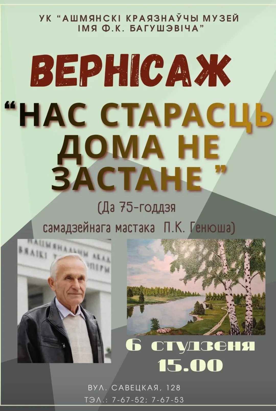 Ашмянскі краязнаўчы музей імя Францішка Багушэвіча запрашае 6 студзеня ў 15.00 на вернісаж, прысвечаны 75-годдзю самадзейнага мастака Паўла Генюша (г. Ашмяны).