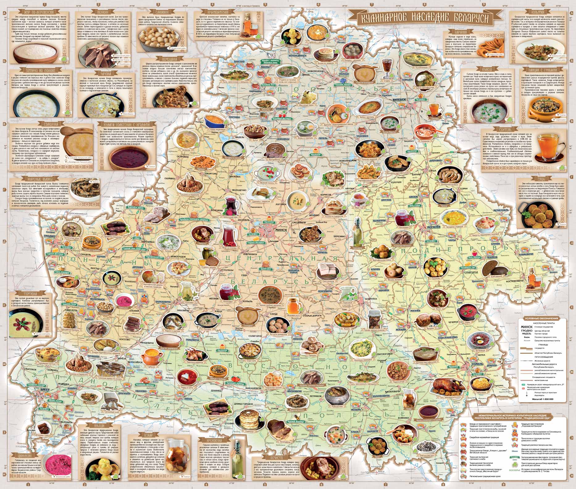 Новая карта масштабом 1:850 000 создана специально для тех, кто хочет изучать Беларусь через ее аутентичную кухню. На ней отмечены регионы и локации, где можно попробовать настоящие белорусские блюда: от знаменитых драников и верещаки до менее известных широкой публике копыток, цибриков или полендвицы.