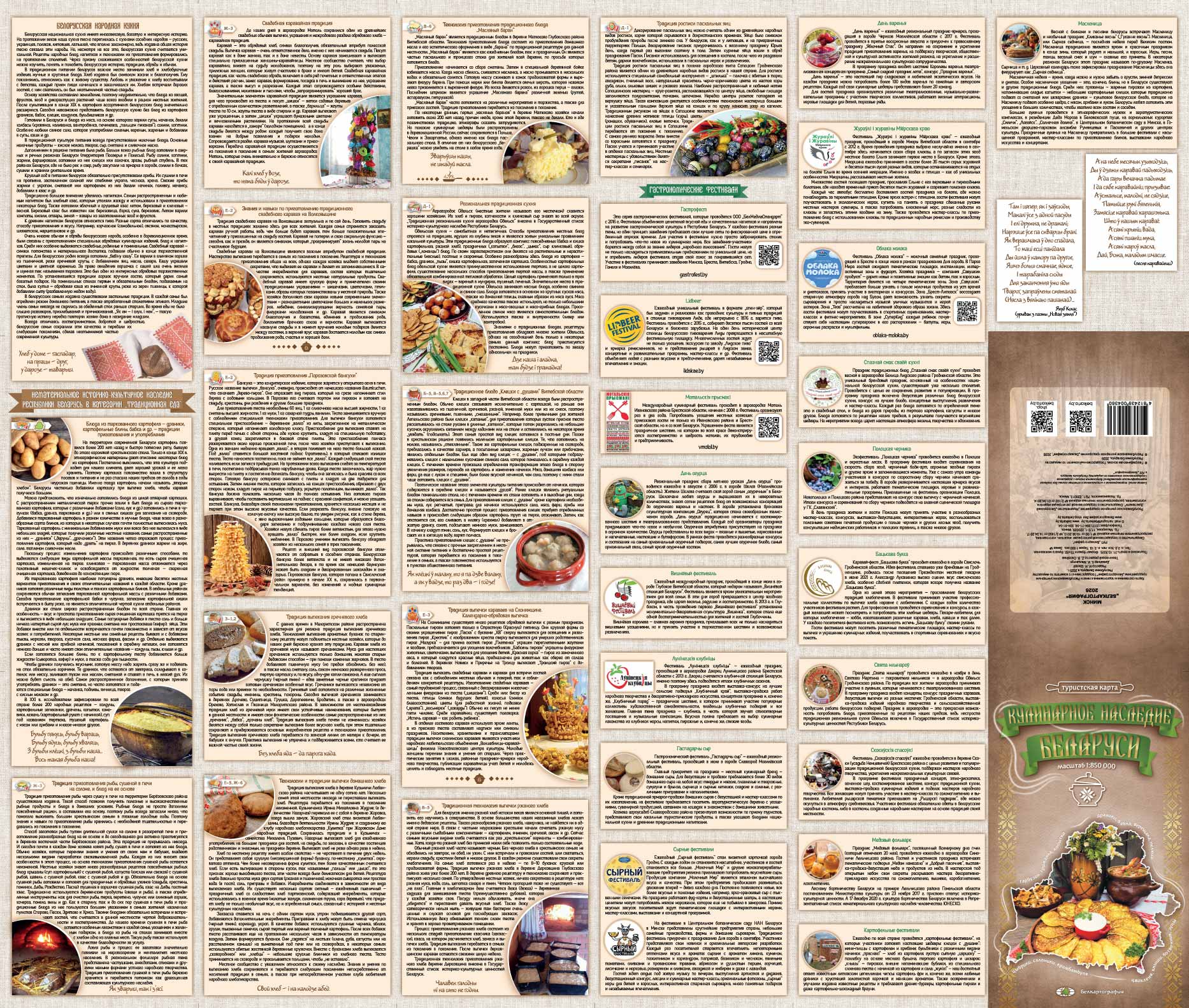 Карта не ограничивается просто перечнем блюд; она погружает в культурный контекст с помощью колоритных белорусских пословиц о еде, таких как «Без хлеба яда – да парога хада». Кроме того, в комплекте с картой идет брошюра с описанием кулинарных традиций разных уголков Беларуси и календарем гастрономических фестивалей. Например, путешественники могут узнать о черничном экофестивале в Полоцке, который ранее собирал любителей ягод и дегустаций.
