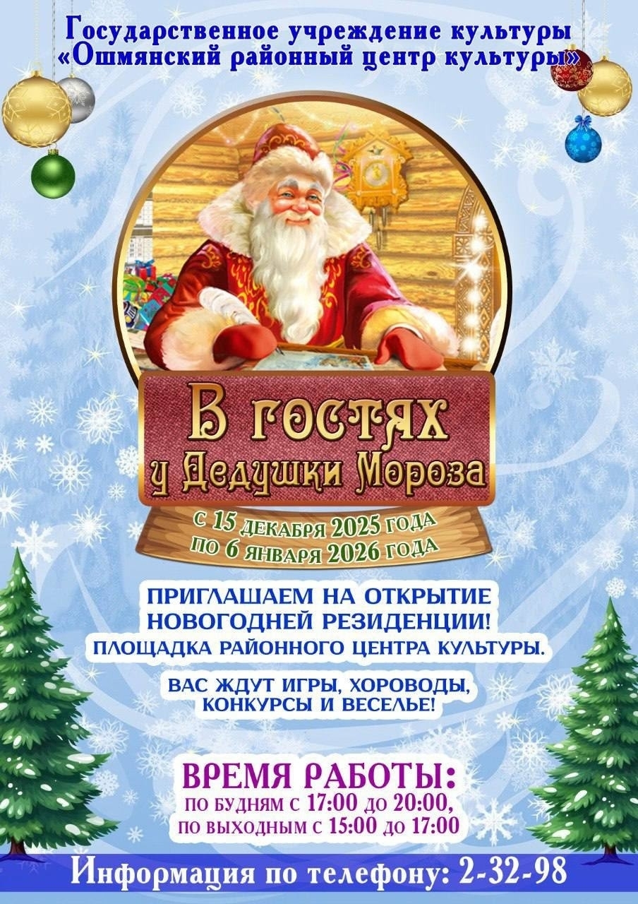 С 15 декабря 2025 по 6 января 2026 года приглашаем жителей и гостей города Ошмяны посетить новогоднюю резиденцию Дедушки Мороза на площадке возле районного центра культуры!
